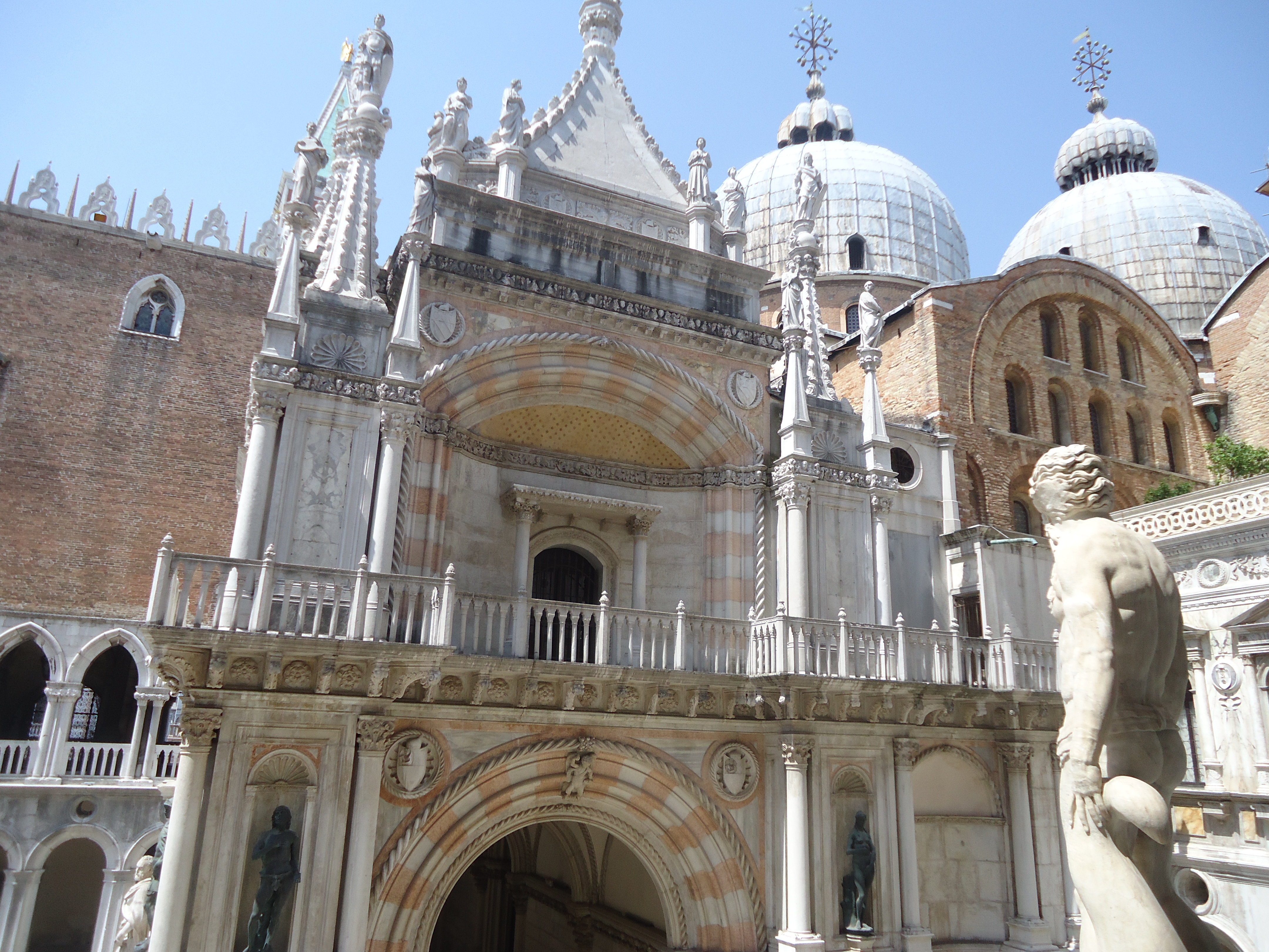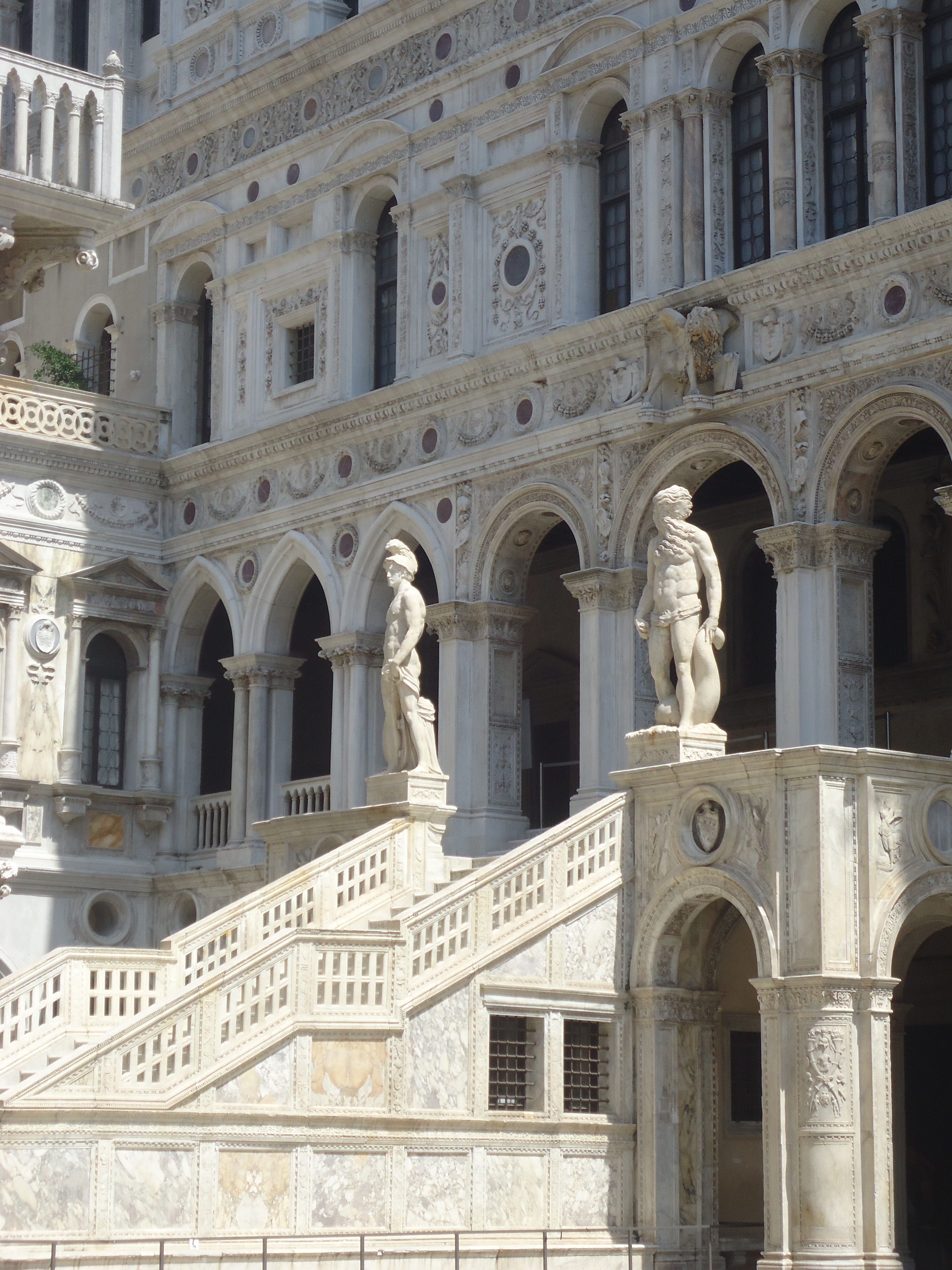 La remarquable façade gothique, digne d’un château de fiction, demeura inchangée, et il en alla de même après les sinistres qui dévastèrent à nouveaux les lieux en 1574 et 1577. L’édifice de l’autre côté du Canale della Paglia, accessible par le pont des Soupirs, fait seul exception, son style correspondant à la fin du Cinquecento. Depuis la chute de la République en 1797, le palais des Doges a eu différentes fonctions, mais à toujours gardé un rôle dans la vie de la commune.